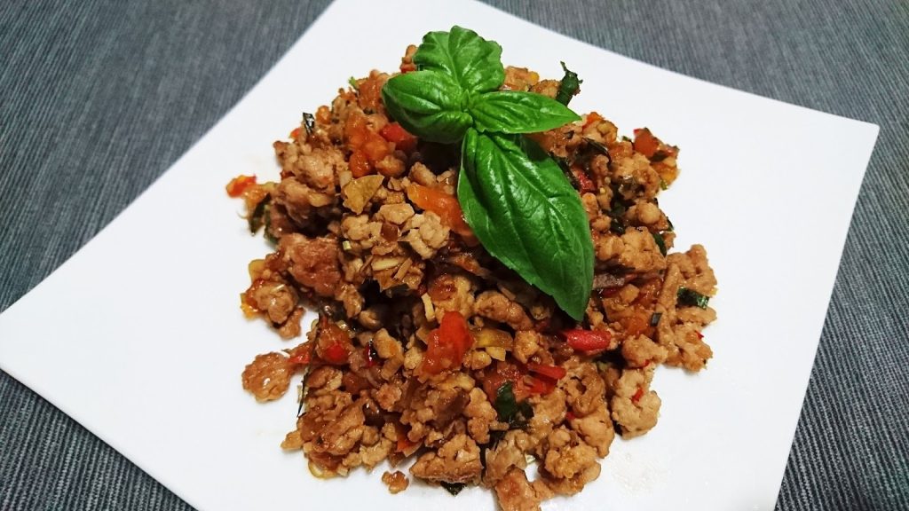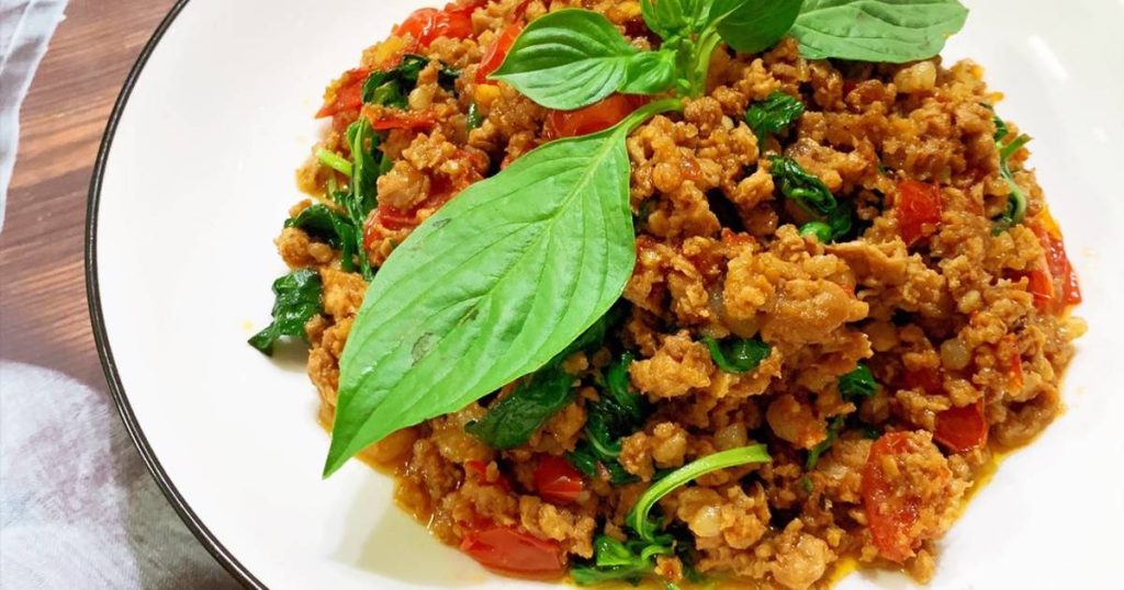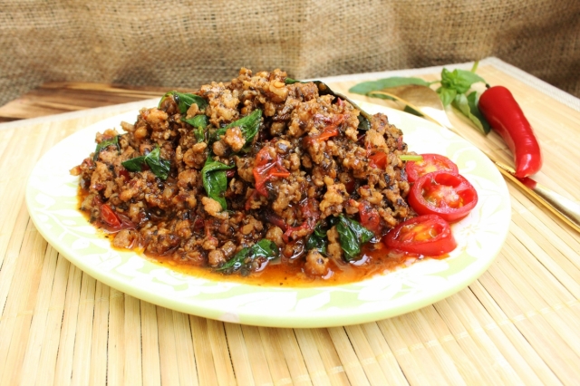 打抛猪肉(Pad Krapow Moo),这道菜,宛若午间小憩或夜幕低垂时分的味蕾盛宴,是泰式风情中一抹不可多得的亮色。想象那细碎的猪肉末,在锅中轻盈起舞,与圣罗勒叶的翠绿、新鲜大辣椒的炽热相互交织,犹如热带雨林中的热烈对话,每一粒食材都承载着阳光的味道与土地的馈赠。