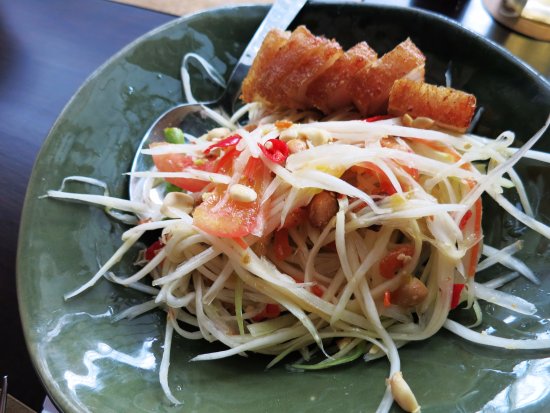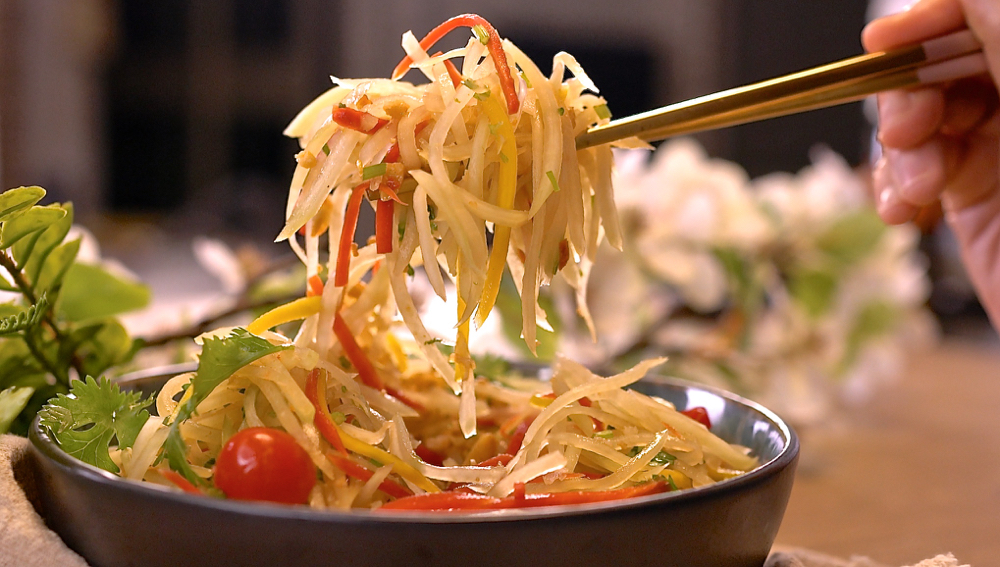 凉拌青木瓜(Som Tum),这道源自泰国东北部依善地区的瑰宝,宛若一道色彩斑斓的味觉盛宴,轻舞于舌尖之上。以古朴的杵臼为笔,大蒜、辣椒、翠绿欲滴的青豆、红艳的樱桃番茄以及薄如蝉翼的生木瓜片,共同绘就了一幅鲜活生动的酸辣交响曲。在每一次杵击之下,它们彼此交融,释放出一种难以言喻的酸甜辣韵,仿佛是大自然最纯粹的情感倾诉,直击心灵。