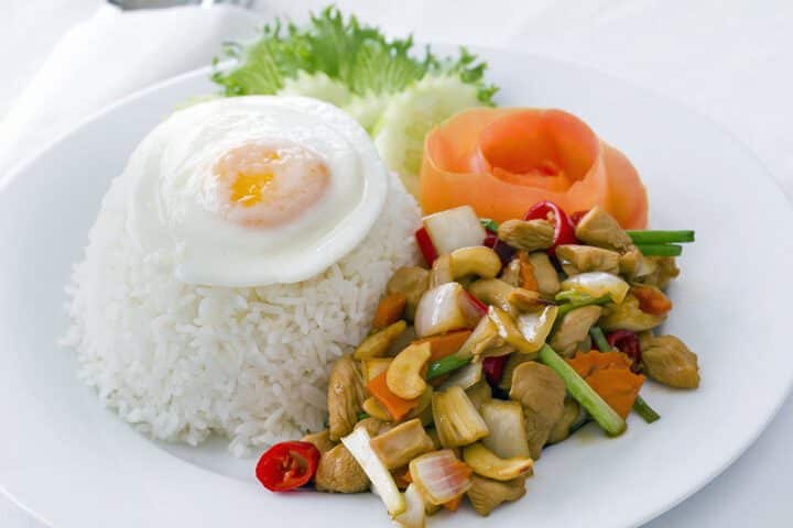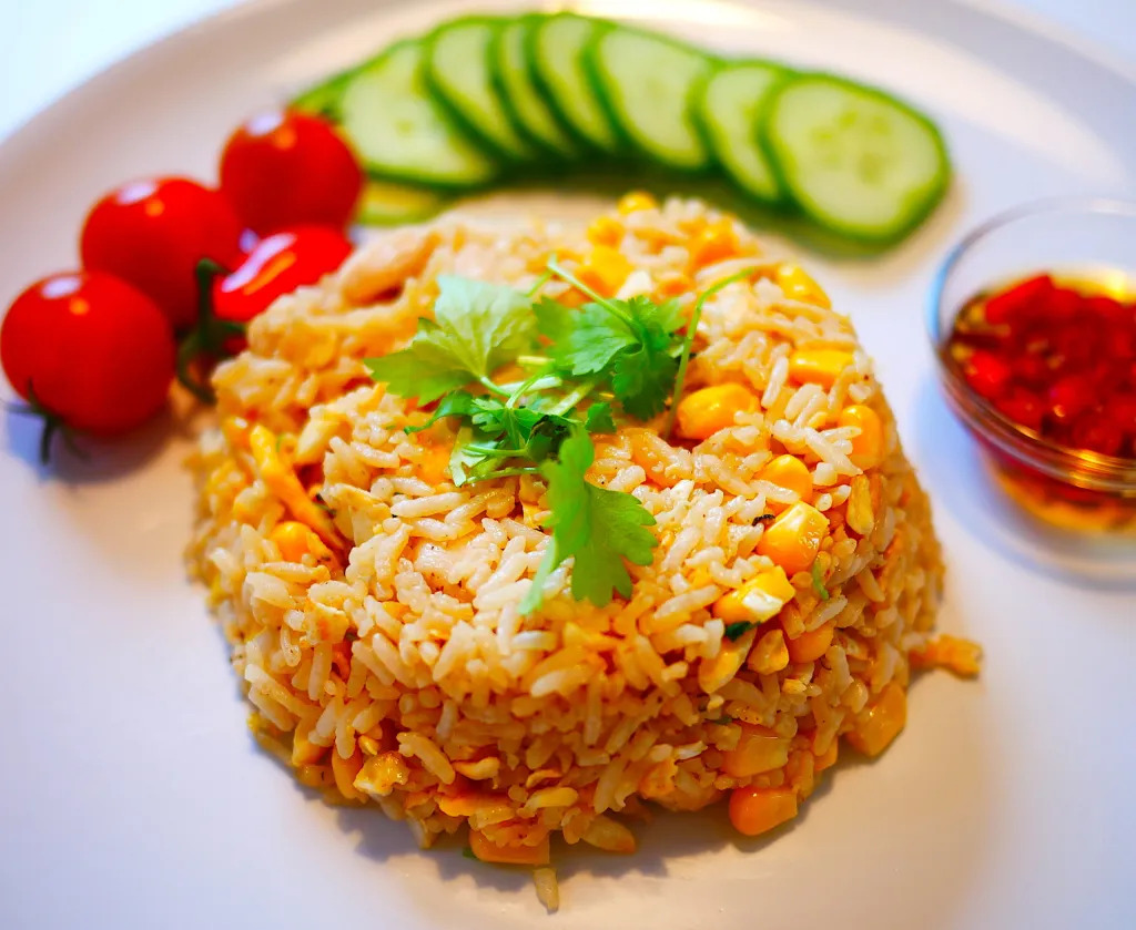 在繁华喧嚣的曼谷街头,泰式炒饭(Khao Pad),这道地道的午间风情诗,悠然地穿梭于食客的心田。它不仅仅是一道菜肴,更是味蕾与文化的温馨邂逅。基础的拌炒间,米饭粒粒分明,与金黄的鸡蛋丝缠绵共舞,洋葱的甜香如同初春细雨,温柔地包裹着每一粒米。