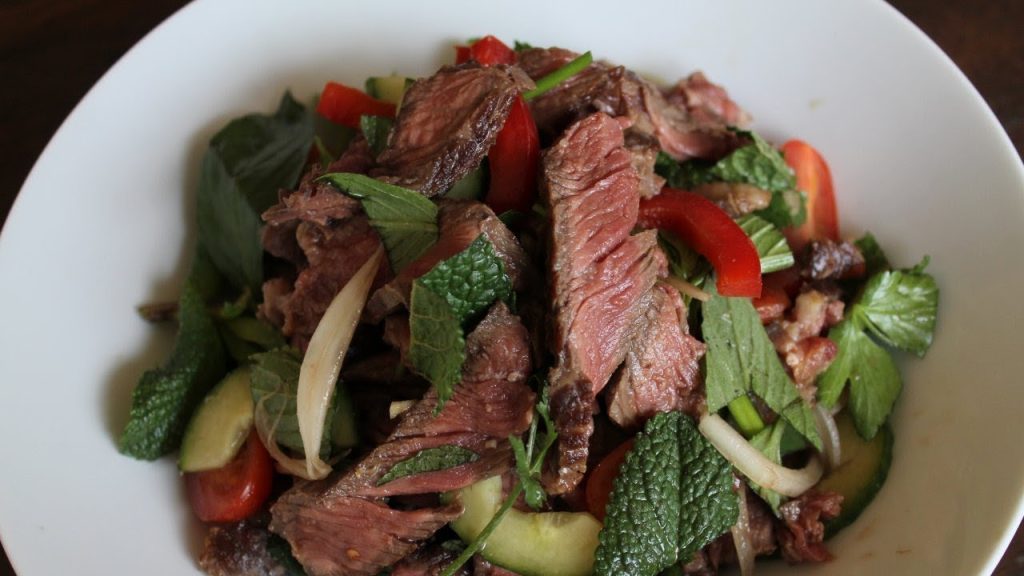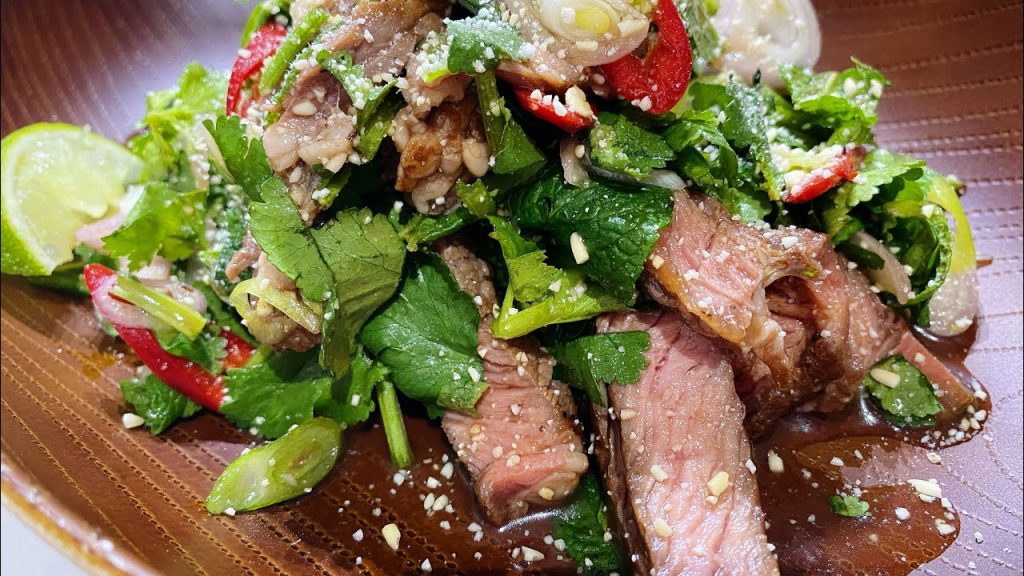 泰式牛肉沙拉(Yum Nua),宛如一幅细腻编织的味蕾画卷,其上轻铺着柔嫩如丝的牛肉条,宛如晨曦中轻舞的绸带,为这清爽的沙拉添上一抹不可言喻的雅致。这道佳肴的精髓,藏匿于那精心调制的酱汁之中,它是一首由莱姆汁的清新、芝麻油的醇厚、豉油的深邃、生姜的热情、大蒜的热烈、鱼露的海洋气息与棕榈糖的温柔甜蜜共同谱写的交响乐。