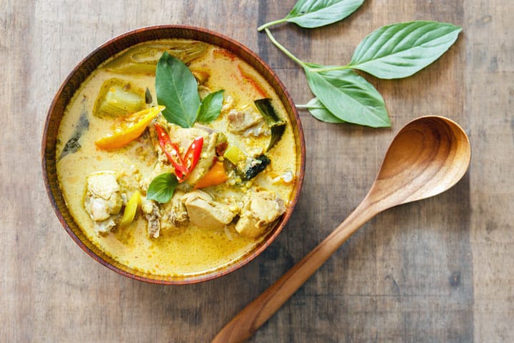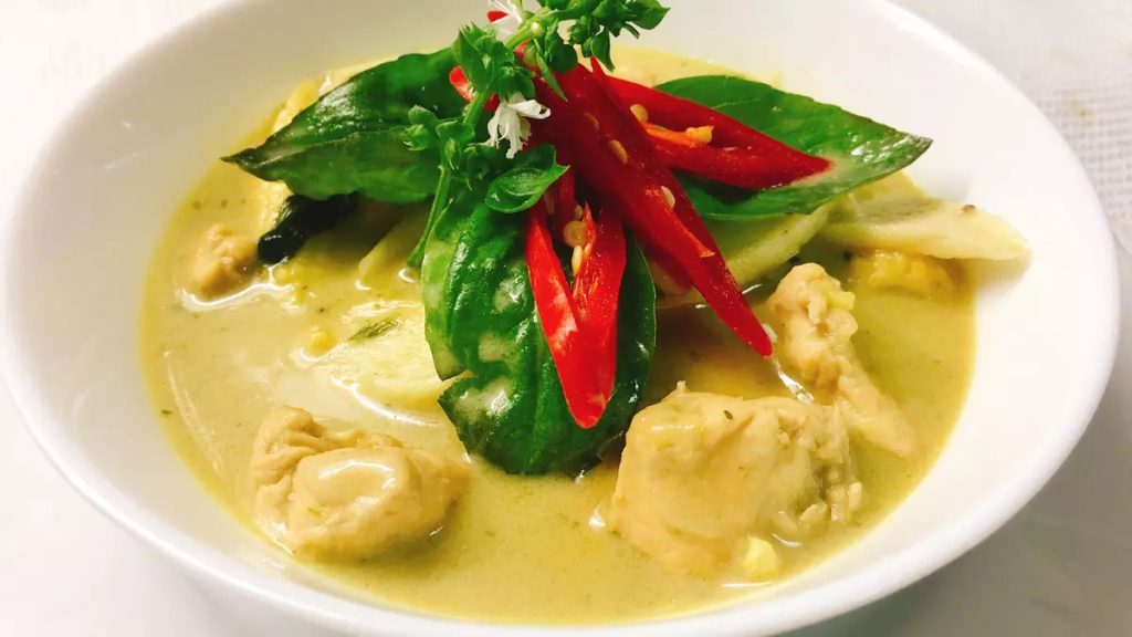 绿咖哩鸡(Gaeng Keow Wan Kai),一抹翠绿中蕴藏着热带雨林的热情与秘密,其独特的色泽如同晨曦初照下鲜嫩的绿叶,轻轻摇曳着来自绿色辣椒的辛辣诱惑。这道菜式,虽与众多泰式咖喱同宗同源,却在细节之处绽放异彩,犹如泰国文化中那抹不可复制的清新与独特。