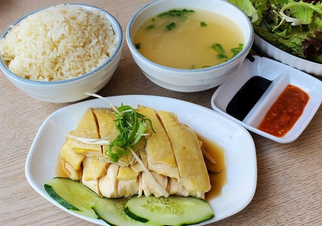 一般都被称为“鸡饭”。鸡汤煮饭,配以白斩鸡、烧鸡蔬菜等,光吃鸡饭就已经有滋味了,辅以辣椒、酱油味道更佳。鸡饭是新加坡传统的美食,因此新加坡人对其要求非常严格,有一些有名的鸡饭经常会有人开车排队去买。不过作为游客,没必要特别计较,基本上口味大同小异,随便一摊都不会难吃,还可以加叉烧、脆皮烧肉等等作为配菜。比较出名的是文东记、伍星、天天等等。