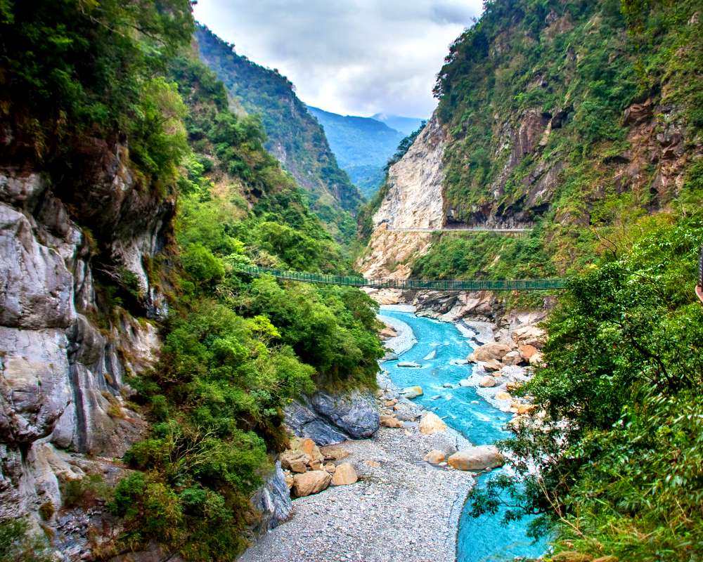 位于台湾东部的太鲁阁公园,以雄伟壮丽、大理岩峡谷景观闻名世界。沿着立雾溪的峡谷风景线,峭壁、断崖、峡谷、连绵曲折的山洞隧道、大理岩层和溪流等风光,令人赞叹。此处的大理岩因受到立雾溪长期侵蚀下切与地壳不断隆起,形成近乎垂直的U形峡谷。