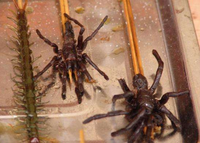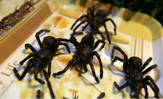 在金边的小街上,可以见到很多特色小吃,烤野鸟、烤鸭、烤乌龟等,最令人称奇的则要数烤毒蜘蛛,烤得入味的蜘蛛笔直地伸展着,比手掌还要大许多,看得人毛骨悚然。