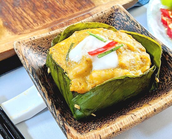 传统的柬国美食,用Amok叶子或香蕉叶裹着鱼肉或鸡肉或牛肉,再加上椰奶、咖喱粉、姜黄粉、柠檬香草等调料,在火上蒸熟。