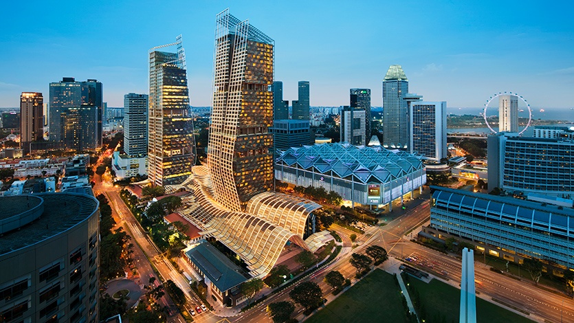 位于滨海湾地区,坐落于地铁系统的车站之一市政厅地铁站(City Hall Station)上方。