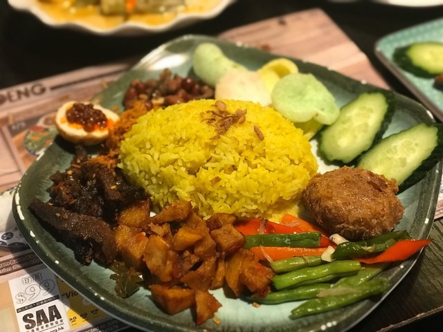 黄姜饭是用椰奶和姜黄烹制而成的印尼香米饭,颜色金黄,象征吉祥美好。常与各种肉类、蔬菜和酱料搭配食用,味道浓郁。