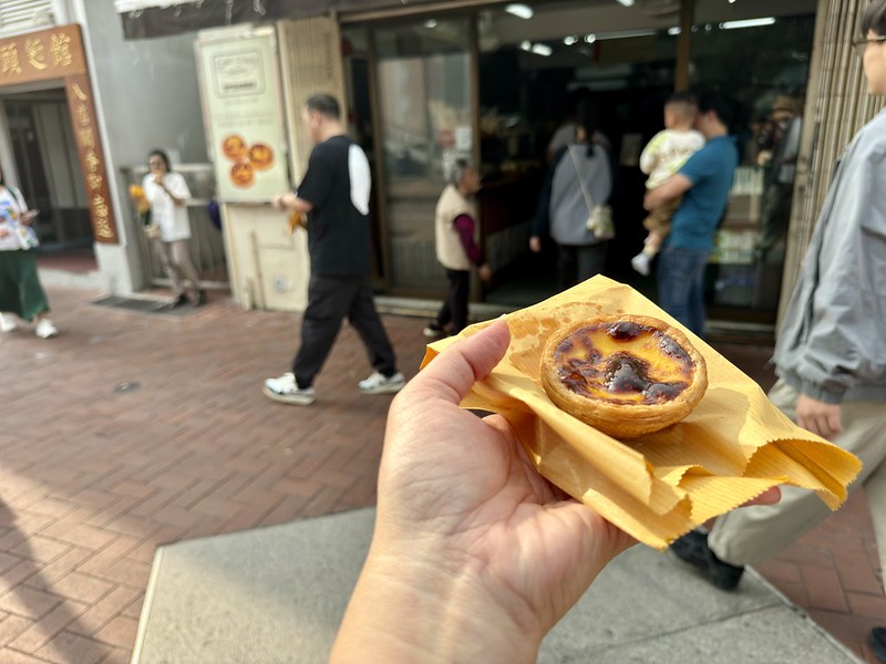 他家的葡式蛋挞也别具一格,比澳门常见的蛋挞外皮厚实,内馅焦糖味更浓,甜度刚好。老板说这才是正宗葡式做法,那种薄皮的其实是英式蛋挞的变种。长见识了!