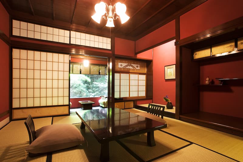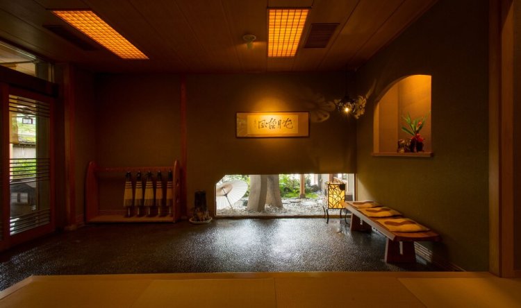 旅馆内优美的庭园为宽永年间所造,风情独具。仅有18间客室,其名亦雅致,如“白峰”、“菖蒲”及“松风”等,氛围安静闲适,并可欣赏庭园美景,其中有六间为配置了自家放流式源泉的露天温泉客室,可临窗听风泡汤,无比风雅。