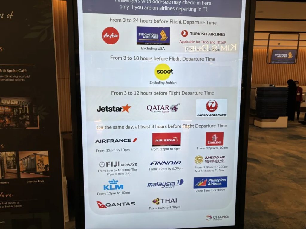 在星耀樟宜里还有提前值机的柜台!如果你乘坐的是上面图片里的航空公司的话,是可以提前值机并办理行李托运的!但是里面没有中国的三大航!唯一的中国航司就是「吉祥航空」了