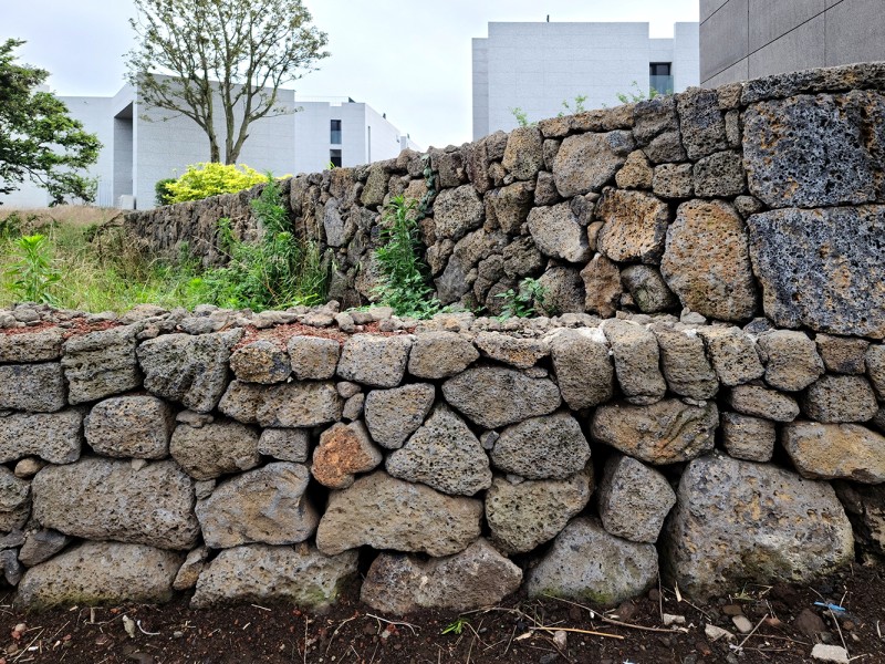 象征着济州的石墙,是几代人劳动的积累。父亲把巨大的石头截成合适的大小,儿子把这堆石头运去垒墙,母亲在翻垦田地的时候,随时把锄头碰到的石块拿去填补石墙的窟窿。我们无从知道,这一简单而辛苦的工作已经重复了多久。但是,如果从天上俯瞰这座岛屿,可以看到大大小小黑色的石墙绘制出自由奔放的线条,遍布于整个岛屿,仿佛是巨大的美术作品。这些以大地为画布、无名创作者的神秘“艺术作品”的特别之处在于其天然之美,而非人工雕琢。