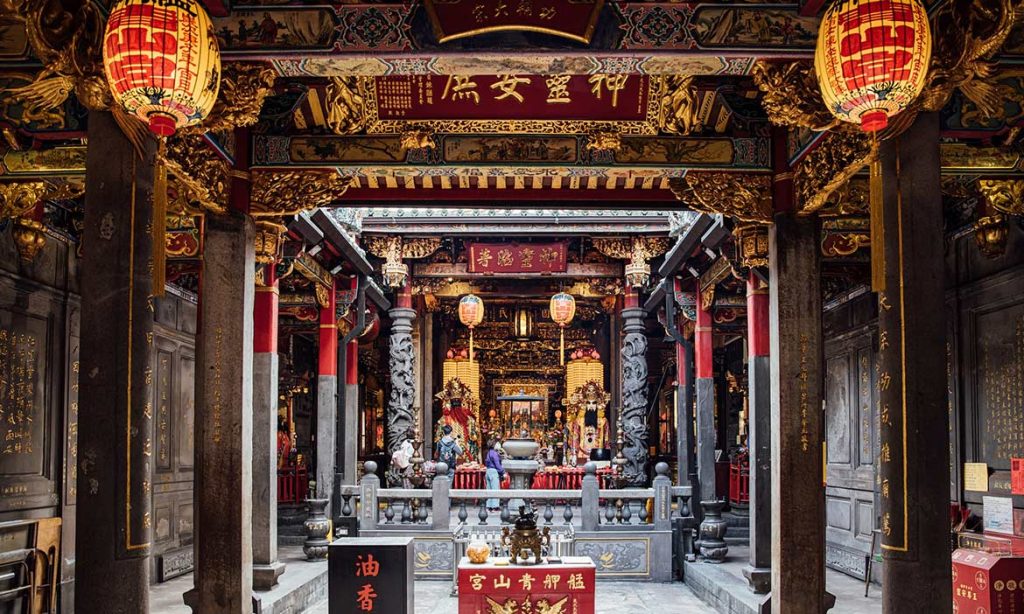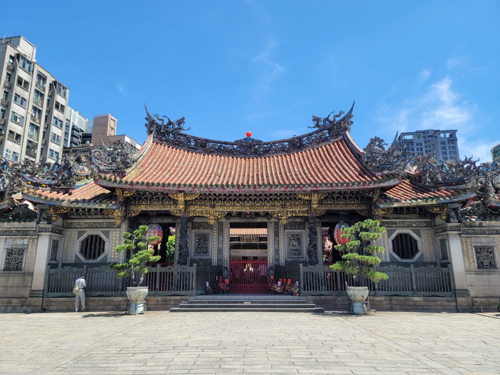 龙山寺位于台湾省台北市西南,临淡水河。清乾隆三年(1738年)创建,至五年建成。其地原名“艋舺”(今万华),为台北市区的发轫点。所供神像甚多,主神观音佛祖,亦称安海观音。每年农历二月十九日神诞,有盛大祭典。原建筑于嘉庆、同治间先后被地震和风雨破坏,现存建筑多为1920—1926年改建,1953—1965年扩建。正门石阶两侧保全的二铜柱是早期遗物,为重要的艺术品。