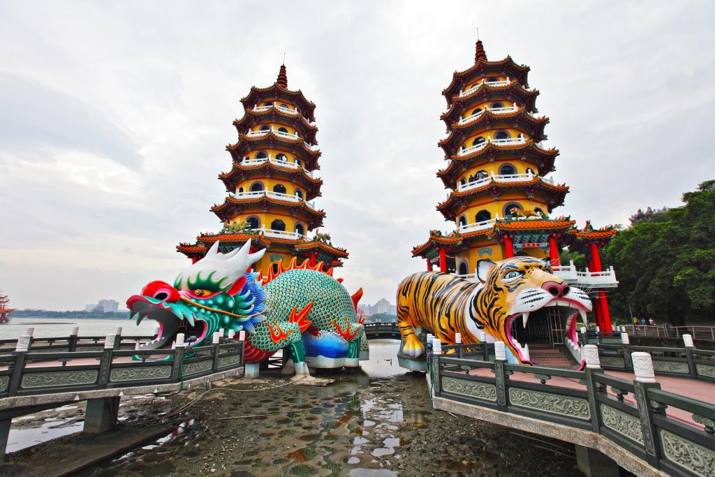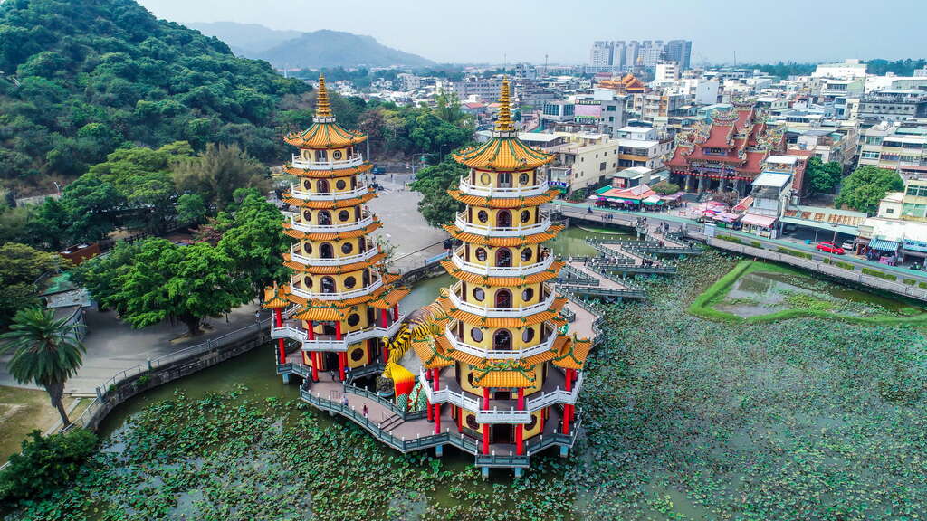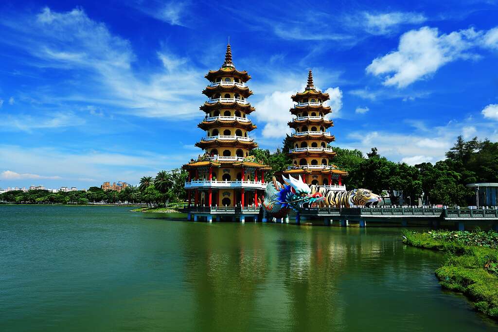 这两座佛塔位于高雄市中心的风景区莲花湖边,可能是港口城市最受欢迎的景点。游客从龙嘴和虎嘴进入寺庙,从每座塔的顶部可以欣赏到湖景。