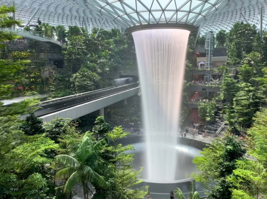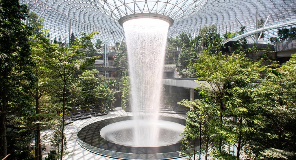 「星耀樟宜」最广为人知的就是全球最大的室内瀑布「雨漩涡( the Rain Vortex )」,位于森林谷植物园,可以看到水柱从七楼高处高空流下,而你一定会好奇水怎么来的?