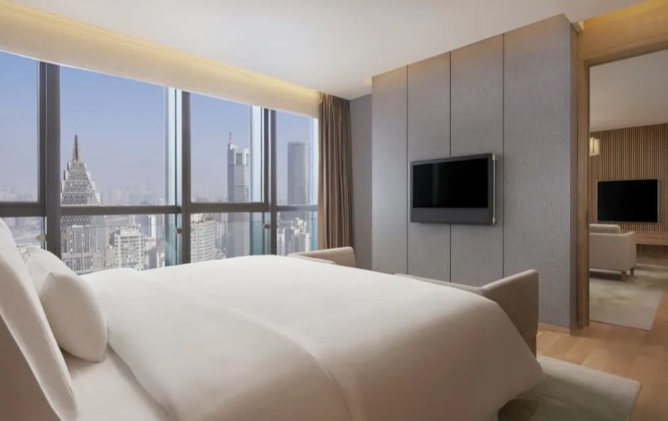 酒店有城景房和湖景房可供选择, 420间现代化客房及套房将当地文化融入空间设计中,步入室内处处点缀彰显南通纺织业“染”、“织”等步骤的工艺品和装饰画,简单自然,与南通传统文化相呼应,在湖景房中透过明亮的落地窗,能俯瞰整个紫琅湖美景。