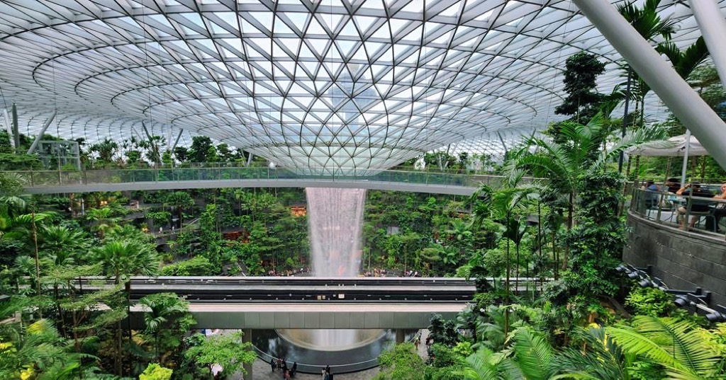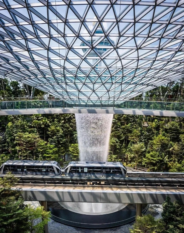 新加坡樟宜机场总面积1300万平方米,有4座航站楼,其中T1航站楼、T2航站楼各有2个指廊,T4航站楼有1个指廊;有3条跑道,长度分别为3260米、4000米、4000米,宽度均为60米,为军民合用机场。 星耀樟宜综合体(Jewel Changi Airport)是一座聚集航空设施、购物休闲、住宿餐饮、游乐项目、景观花园等多功能于一体的机场综合体,位于T1、T2、T3航站楼和航管塔台合包区域,总面积13.57万平方米,整体结构为11层,其中地上5层、地下5层,地下二层设夹层;地上部分为穹形薄壳结构玻璃屋顶,中心向下凹陷构成雨旋涡。这个把森林和瀑布搬进去的超大机场,号称全球最美机场,梦一样的存在。