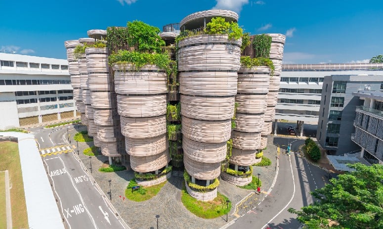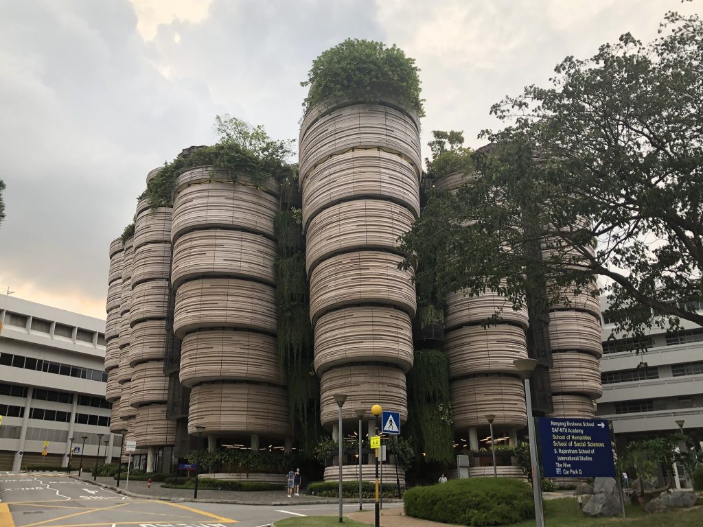 南洋理工大学习中心建筑像“蜂巢”,也称“小笼包”,是南大最有名的一道风景,也是世界级的地标性建筑。这座多功能建筑由托马斯·赫斯维克设计,占地面积为2000平方米,共有8层,可以供33000名学生使用,于2015年完工。它拥有十二个逐渐向底部收拢的塔楼,有序地环绕着一个巨大的中庭空间,提供了56个没有拐角、没有明确前后之分的教室。旨在提供一个与现代教学方式相适应的独一无二的设计。