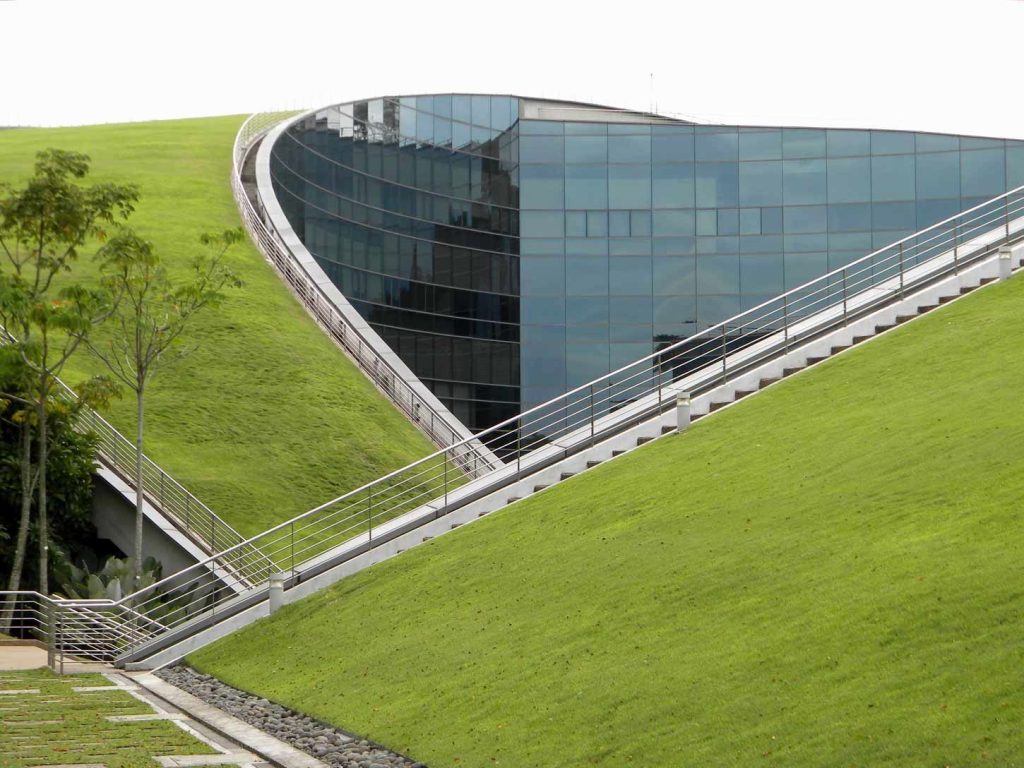 艺术设计与媒体学院这个绿色屋顶建筑是南洋理工大学的一个标志性建筑,共5层,其设计将生态环保理念和现代建筑相结合,从卫星图像上看,它的绿色屋顶像一只绿色的眼睛,非常独特。由新加坡CPG集团操刀设计,其屋顶绿化由一系列经过技术认证的节能设备和翠绿草坪构成,形成了蔚为壮观的绿色景观。弯曲的绿色屋顶将建筑与校园内的其他建筑区分开来,但同时景观与建筑之间的界线又模糊不清,使得整个建筑与周围的自然风景完美结合,完全融入绿色之中。