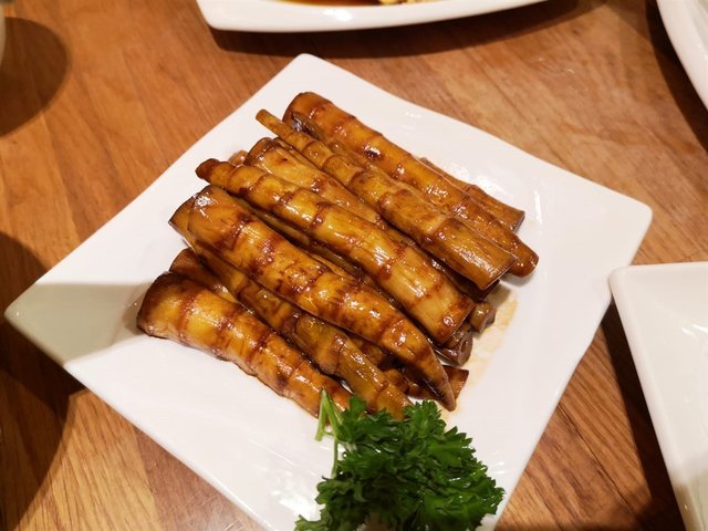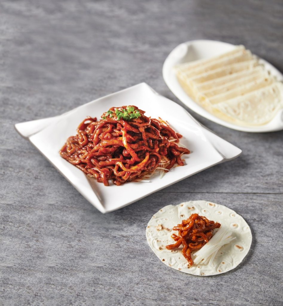 在乐天皇朝,还可以品尝到北京名菜京酱肉丝。香味浓郁,肉丝滑嫩,手工面皮将肉丝和大葱卷起食用,咸甜适口,别具风味。