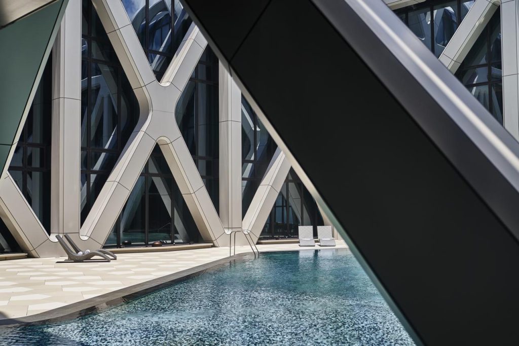 摩珀斯酒店是已故传奇女建筑师扎哈‧哈迪德(Zaha Hadid)的生前遗作。她的设计会非常大胆的运用空间和几何结构,不管是内部还是外表。摩珀斯是全球首座,自由形态外骨骼结构建造的摩天大楼,大堂几十米的空高没有一根柱子,不管从哪个角度看都有独特的一面。