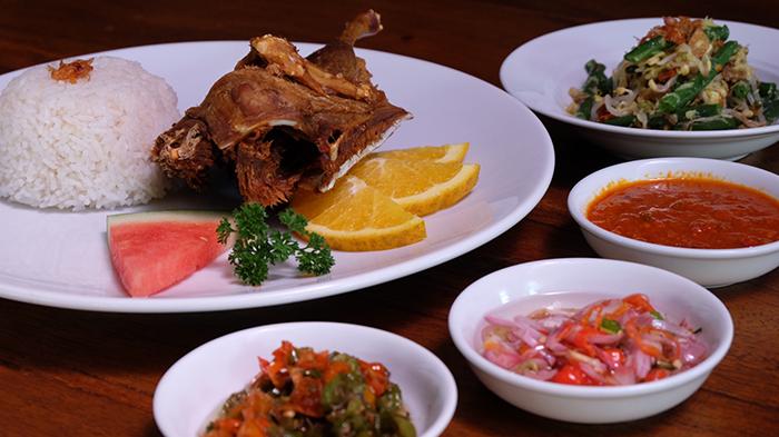 Bebek=鸭子,用调味料和特制的香料(包括青葱、大蒜、生姜、辣椒、花生等)按一定比例进行腌制,直至完全入味,再用香蕉叶包裹起来炭烤,需历时数小时才能完成这道巴厘岛美食的代表作之一。据传,betutu曾经是国王最喜欢的一餐。因此,这道美食以如此繁杂的程序烹饪并不奇怪。而称之为“脏鸭”的由来原因有二说;一是鸭子散养在巴厘岛有名的水稻田里,吃着野外小虫小鱼长大,常常搞得浑身泥巴;二是鸭子在烹制过程中,经过香料腌制、油炸、烧烤等漫长的过程,表皮看起来颜色重重的,所以被称为“脏鸭”。鸭肉经过长时间的烹调,肉质鲜嫩入味易入口,融合了传统巴厘岛混合香料的甜味和辛辣味,色味俱佳。烤成棕色的鸭肉用手一撕,搭配小菜再放在翠绿的芭蕉叶上,绝对美味可口~