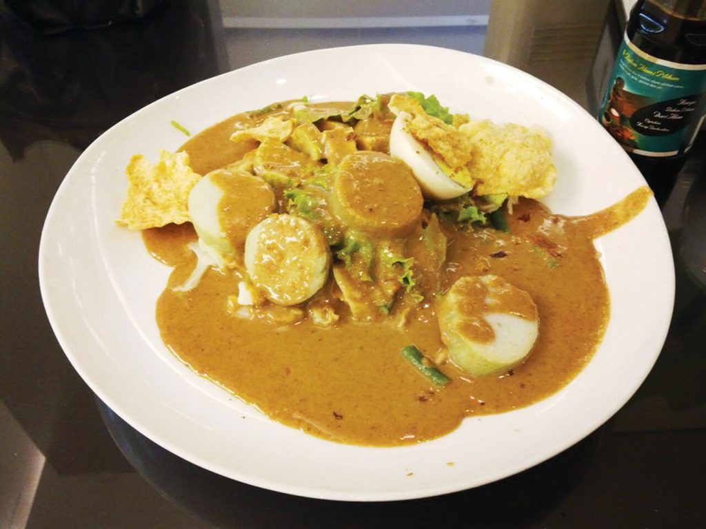 切好白焯的蔬菜,水煮蛋,再加一勺花生酱,看似普通却又美味的印尼经典凉拌什锦菜就可端上餐桌了。典型的印尼花生酱一般现做现吃,是用烤花生、辣椒、虾酱、酸角或汁,再加些糖和盐,研磨而成的浓郁酱汁。Gado gado这个词意思就是混合混合,这道常见的色拉有时还会配上炸豆腐片或天贝,及油炸鱼饼。
