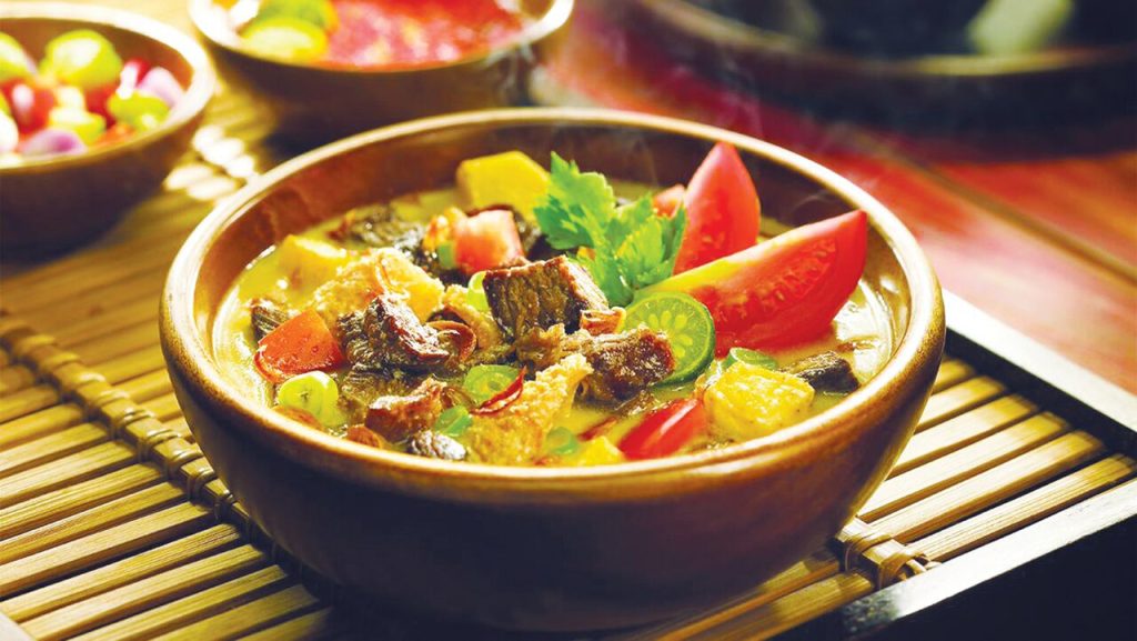在雅加达,印尼传统汤索托(Soto)就是”巴达维索托”(Soto Betawi)。巴达维索托是一种呈黄色的椰奶肉汤,食材包括牛腩、牛肚、洋葱、大蒜、西红柿、土豆,再配以特制的香料,如香茅、橙叶、柠檬草、小茴香、肉桂、肉豆蔻、胡椒、月桂叶和高良姜等。椰奶使汤口感柔滑,喜欢食辣的印尼人,还会在汤里加上特制的索托辣椒酱。巴达维索托通常装在碗里,上面洒上一些脆脆的炸葱头,配着一份蒸米饭和印尼泡菜(acar)一起吃。