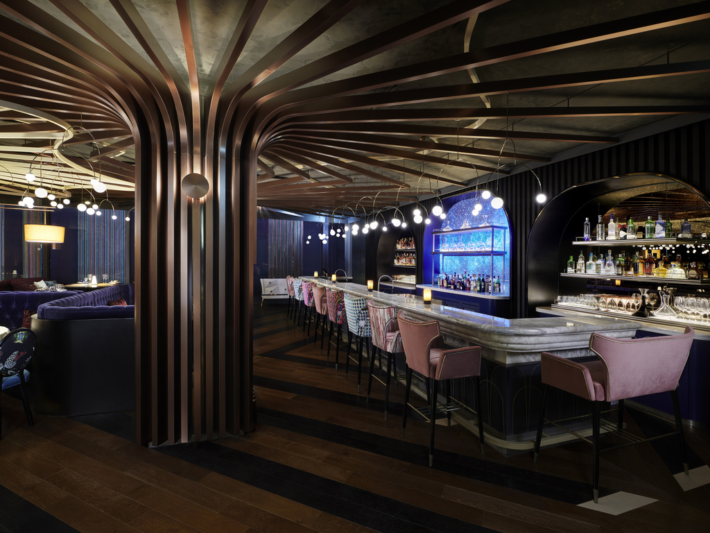 酒店里面放置了将近四百件现代艺术作品,从电梯间的波塞冬雕塑,到健身区的马蒂斯版画;从今年亚洲NO.69餐厅Eatanic Garden的金碧辉煌,到酒吧里翩翩起舞的三角形蝴蝶灯饰,如同美术馆展览一样令人叹为观止。