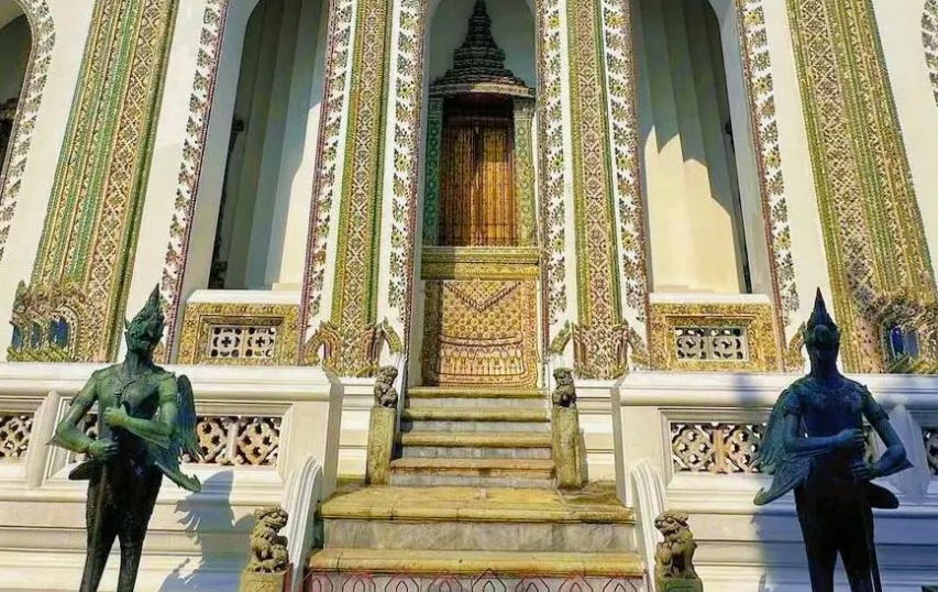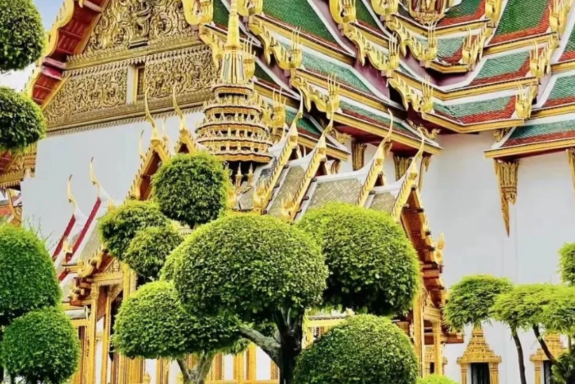 曼谷的第一站,从大皇宫开始。作为泰国王室的皇宫,大皇宫一直深受旅人的喜爱。这座有着“满城尽带黄金甲”的氛围感的宫殿建于1782年,是历代皇宫保存最完美,规模最大的皇宫。步入大皇宫,金色的浮雕和鲜艳的琉璃瓦铺就的墙壁,显得庄严高贵。金碧辉煌的佛塔耸立在宫殿周围,平时除了举行盛典外,这里都是供游人参观的。