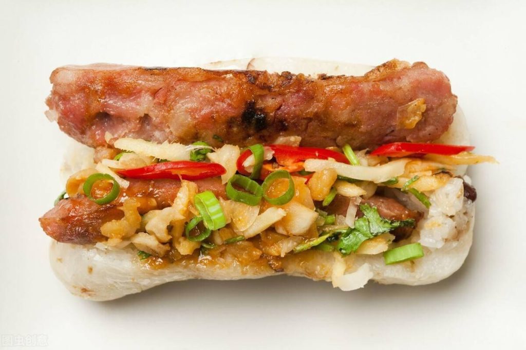 大肠包小肠是台湾夜市摊上非常受欢迎的一道风味小吃,和美国的热狗有点相似,它主要是把煮熟的糯米肠切开,然后包上一根煎熟的台式小香肠,经过烤制的大肠外皮微酥,内馅米粒饱满,咬上一口,肉香味浓郁。