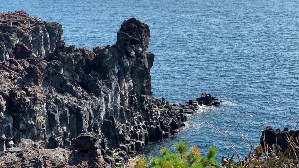 这里是韩国规模较大的天然纪念物柱状节理带,它是熔岩从火口流出,并迅速冷却,收缩作用的结果,层层叠叠如屏风般的石柱展现了自然的神秘。