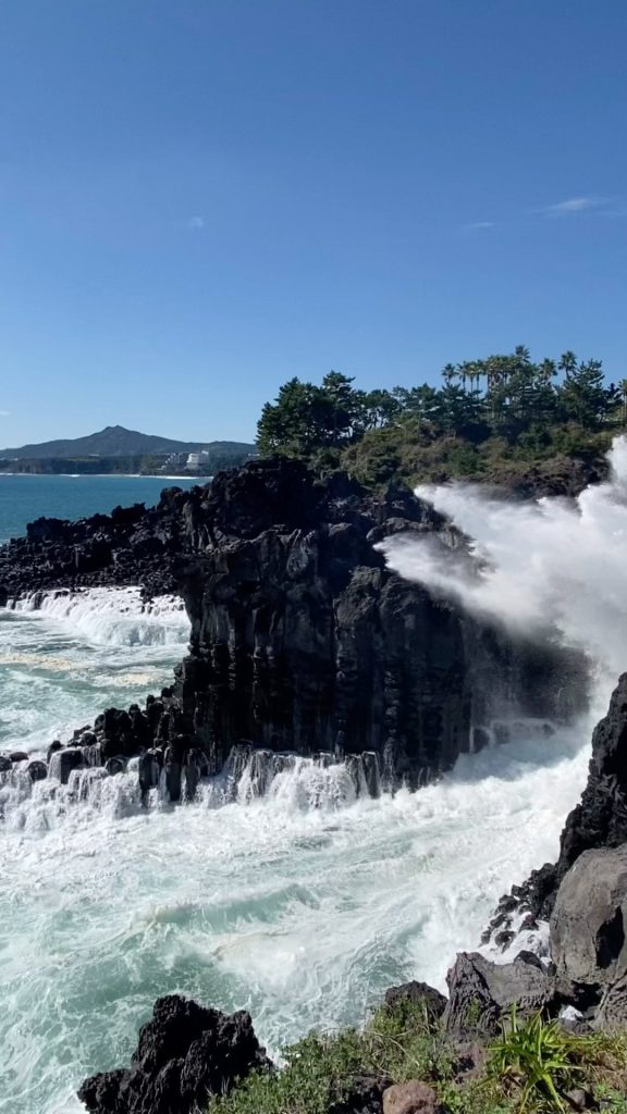 济州岛旅游的象征,是熔岩喷发后冷却形成的火山岩,形似巨龙咆哮,海浪大时十分壮观。