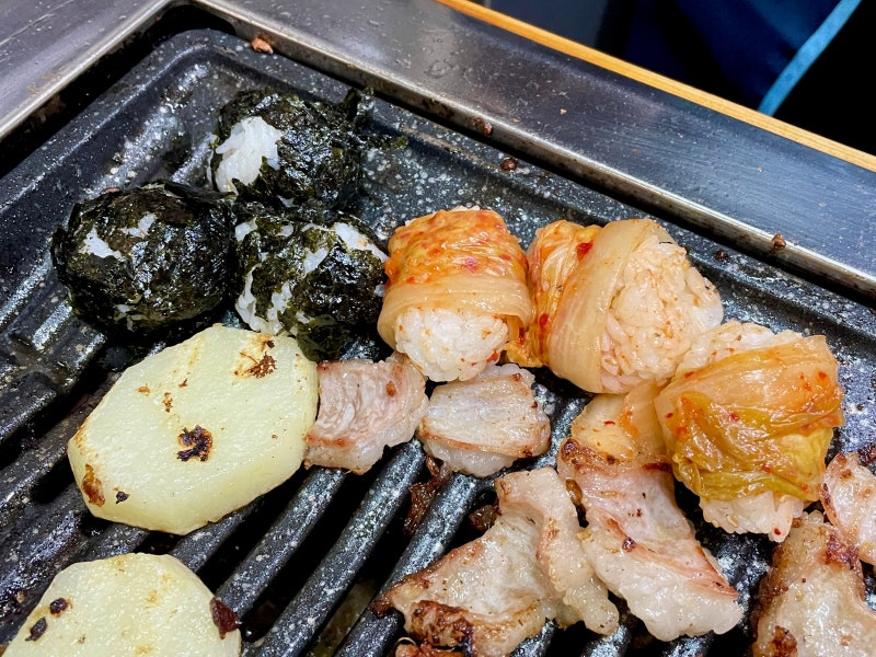 这家店不同于其他店用煎锅烤肥肠,它是跟烤肉一样用的烤盘,这样烤出来的烟会被吸走。小菜很多,搭配大蒜一起吃,味道太上头了。