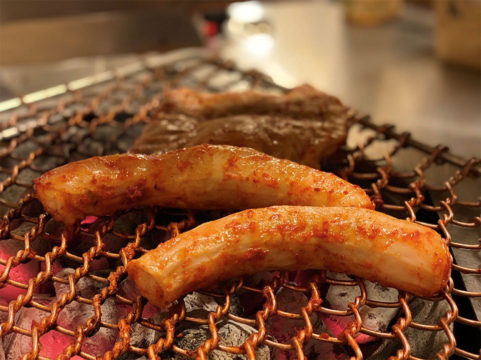 爱吃内脏的小伙伴,谁看了滋滋冒油的大肠会不心动?这家有烤牛小肠、烤大肠、烤牛皱胃和牛肚,一根大肠烤几分钟差不多快熟的时候,用剪刀剪成一段一段的,每一口都散发着浓郁的肉香,烤肠的表皮微微焦黄,内里却是嫩滑多汁,一口咬下,汁水瞬间在口中爆开,搭配着烤杏鲍菇,很有嚼劲,不沾料吃也很美味。绝对让你爱不释口!