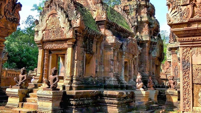 女皇宫,又称Banteay Srei或斑蒂斯蕾,位于柬埔寨暹粒市,是吴哥古迹群中最为精致和独特的建筑群之一。建于公元967年,主要供奉印度教的湿婆神。女皇宫采用高棉特有的红土建造,色彩艳丽,建筑表面几乎完全被细腻繁复的浮雕覆盖,被誉为“吴哥艺术之钻”。寺墙上雕刻着印度教神话故事,包括湿婆神的事迹、战神克里希纳杀死暴君等。女皇宫以其小巧玲珑、优雅精致的设计而闻名,是吴哥文明中不可错过的瑰宝,吸引着无数游客前来探访和欣赏。