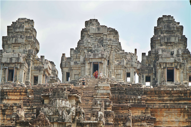 茶胶寺,又称塔高寺或达高神寺,位于柬埔寨吴哥王城胜利门以东,是吴哥窟古迹中的一座印度教金刚宝座塔式庙宇。该寺由阇耶跋摩五世始建于10世纪末至11世纪初,但未能完工。茶胶寺以其独特的扇山金字塔结构和五座密檐式方塔而闻名,是高棉建筑史上第一座全砂岩石建筑。虽然未经过多装饰,但其简洁的建筑风格和雄伟的气势仍让人震撼。茶胶寺的顶端可俯瞰整个吴哥城,是探索吴哥文明不可错过的景点之一。近年来,中国团队对茶胶寺进行了保护修复工作,使其得以更好地展现给世人。