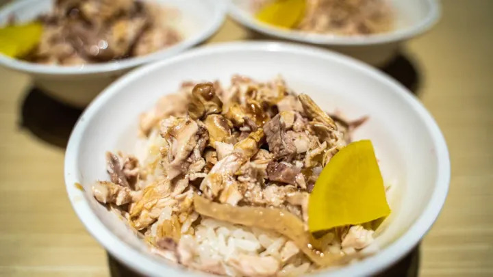 喷水鸡肉饭以滑嫩的白斩鸡搭配油亮的白米饭,再淋上香气四溢的鸡油和酱汁,简单却不失美味,是众多嘉义人早餐的经典选择。据悉,喷水鸡肉饭是1949年由林添寿先生所创,林先生的店本来卖的是卤肉饭,但由于当时物质环境不佳,要过年过节才有鸡肉吃,结果林先生用他的创意把切片火鸡肉拿来搭配白饭,食客食后赞誉有加,随后这种鸡肉饭做法便风行全台,直到如今。