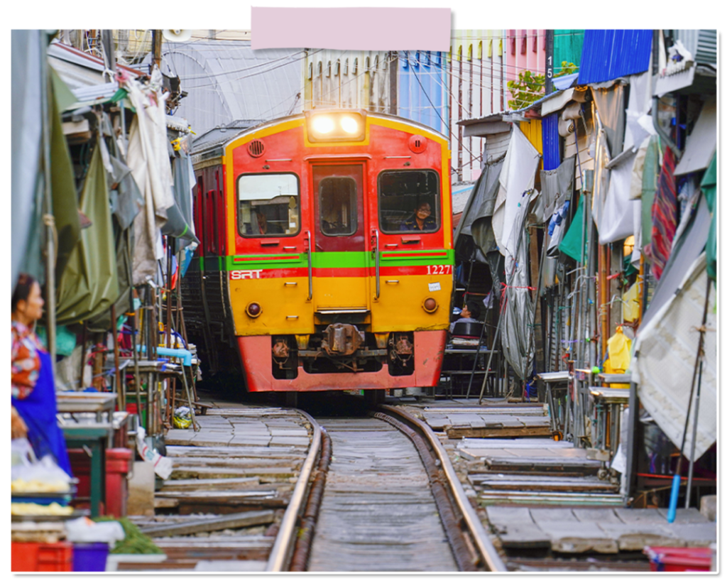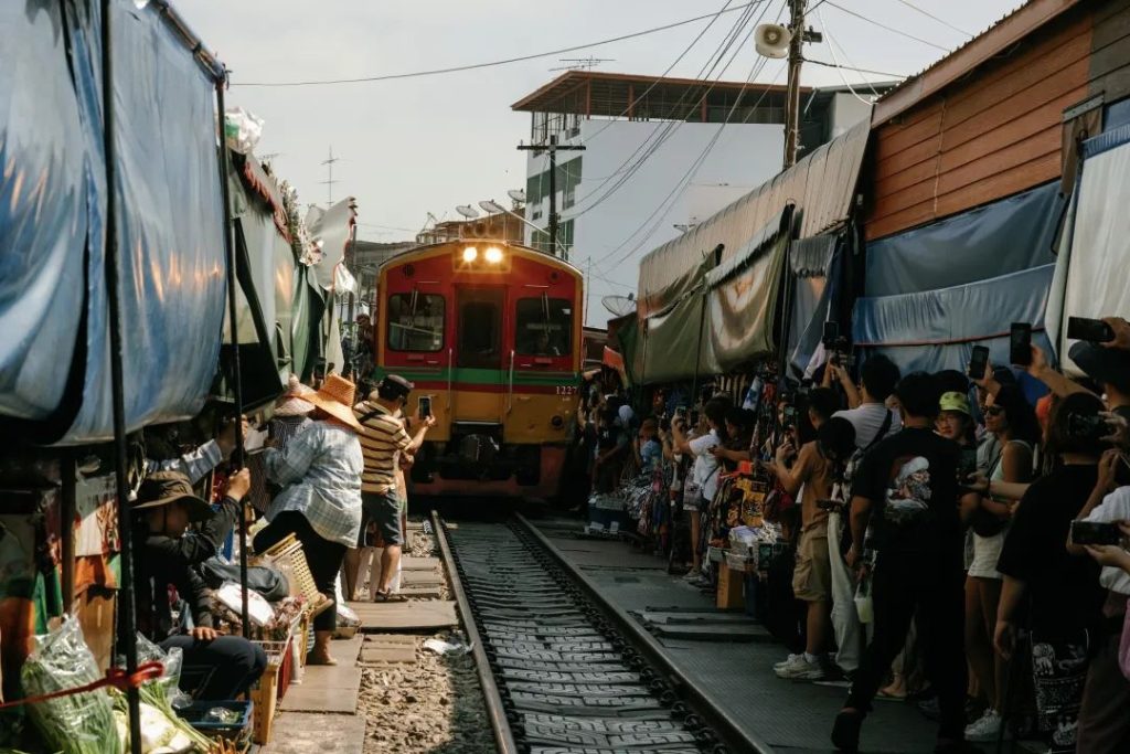 来曼谷逛市场,算是一种很入乡随俗的在地体验了。而且,热带市场因其热烈氛围,别有一种迷人气质加持。美功铁道市场就很出名。这在全泰国都是独一无二的风景线。它是一个长条形的市场,一条铁道穿市场而过。摊位紧挨着火车轨道,让每次火车进站都变得很刺激。