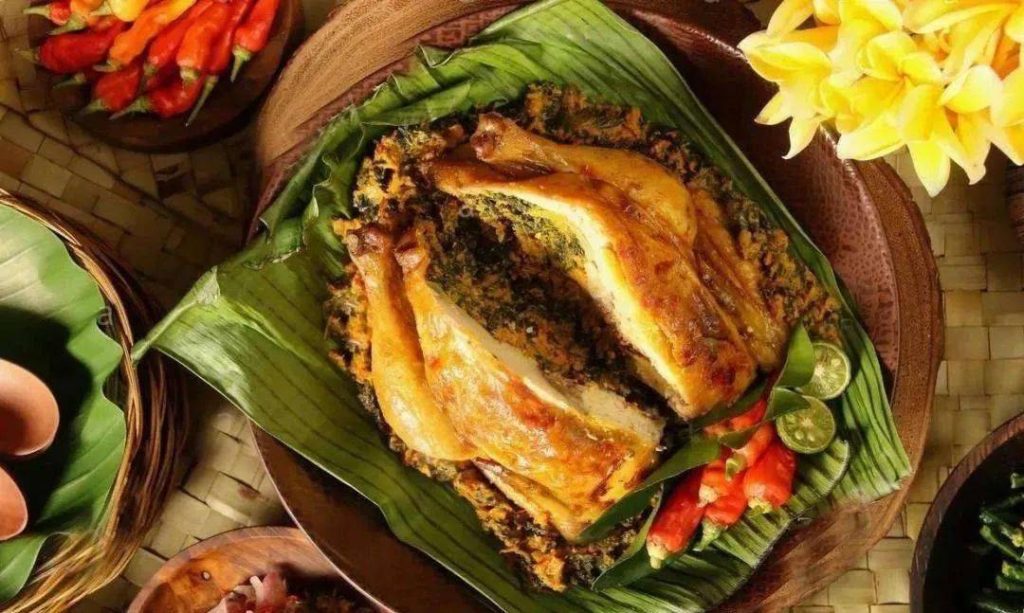 蕉叶鸡(Ayam Betutu)是巴厘岛标志性的佳肴,在一只整鸡里填充上传统的香料,然后用香蕉叶包起来,置于炭火中烘烤6到7个小时,非常香酥入味。