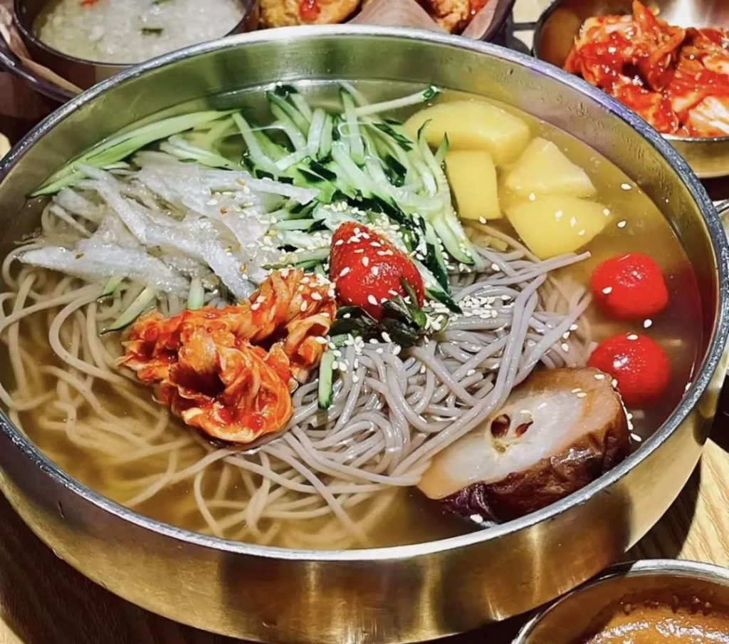 韩国冷面是民间传统面食,食用时在碗内放冰块,再放入荞麦面,配以牛肉片、鸡蛋丝、鸡肉丸子、苹果片、泡菜、黄瓜片,加上芝麻、香油,浇入冷面调味汁即可。