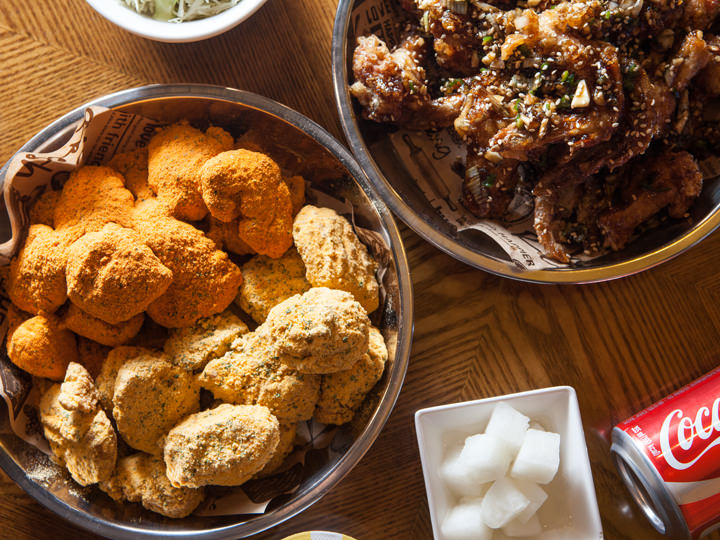 韩国炸鸡外皮酥脆,内里鲜嫩多汁,通常搭配各种酱料食用,尤其是甜辣酱、蜂蜜芥末酱,为其增添了独特的韩式风味。