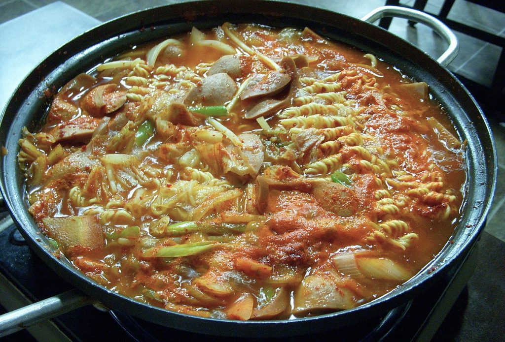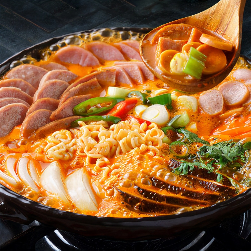 部队汤是一种将泡菜、蔬菜、午餐肉、脆皮肠等一起混煮的韩式火锅,热气腾腾、味道酸辣。发源于首尔近郊的“议”,是战争后从美军部队流传下来的,因而得名。