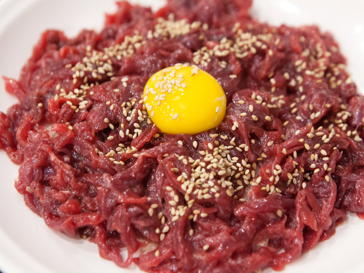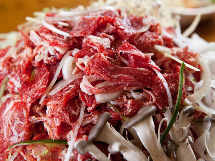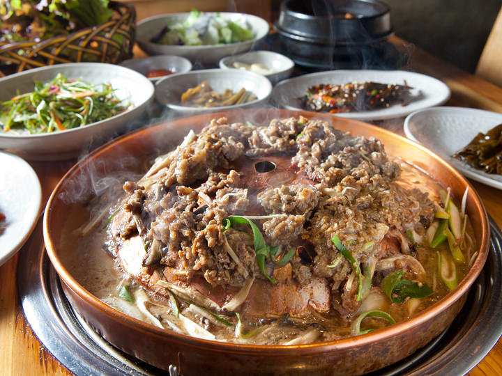 调味牛肉也是相当有韩国特色的一道料理。牛肉经特制的酱汁调味过,与蔬菜、蘑菇、粉条等一起堆放在扁平的敞口锅上炒煮。薄薄的牛肉肉质不用说,味道甜甜的鲜鲜的,是韩国人喜爱的那种独特味道。