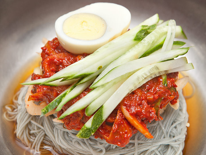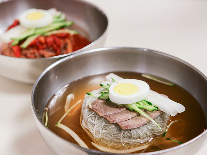 冷面是在小麦粉里掺入少量绿豆粉制作的面条,放上薄皮肉,黄瓜,梨和其他蔬菜和鸡蛋做衬托,将牛肉长时间煮成的汤冰镇后浇上制作而成。