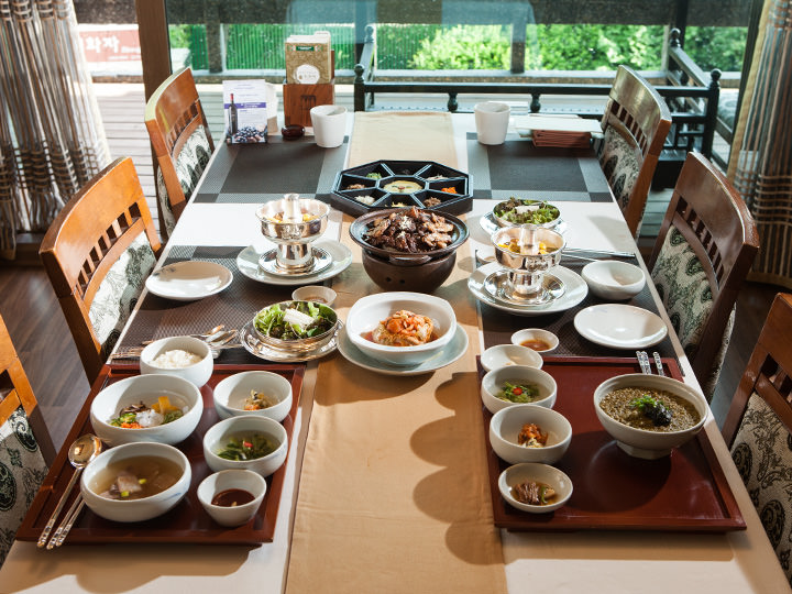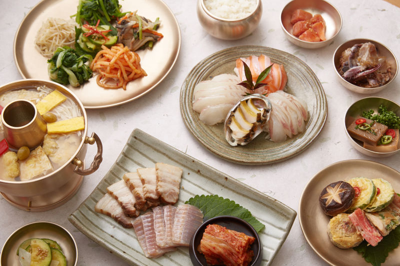韩定食一般都是大小碟碗摆满整个餐桌,红黄白绿各种颜色搭配从视觉上就能马上提升食欲。菜品份量少、种类多,让人感觉很精致。可在一顿餐中品尝多种韩国美味。一般每一样菜品都可以要求免费追加。