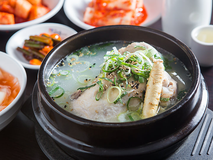童子鸡的腹中塞满糯米、大枣、板栗及大名鼎鼎的高丽人参等,经长时间炖煮而成。鸡肉软嫩滑爽,鸡汤鲜香味浓郁,散发着浓浓的人参味。有些店铺还使用各种韩方药材炖出味道独特、更加滋补的参鸡汤。