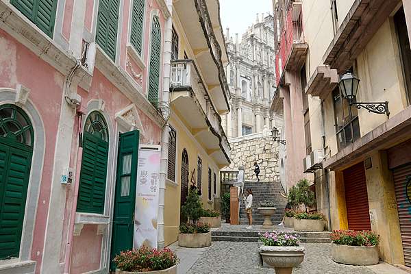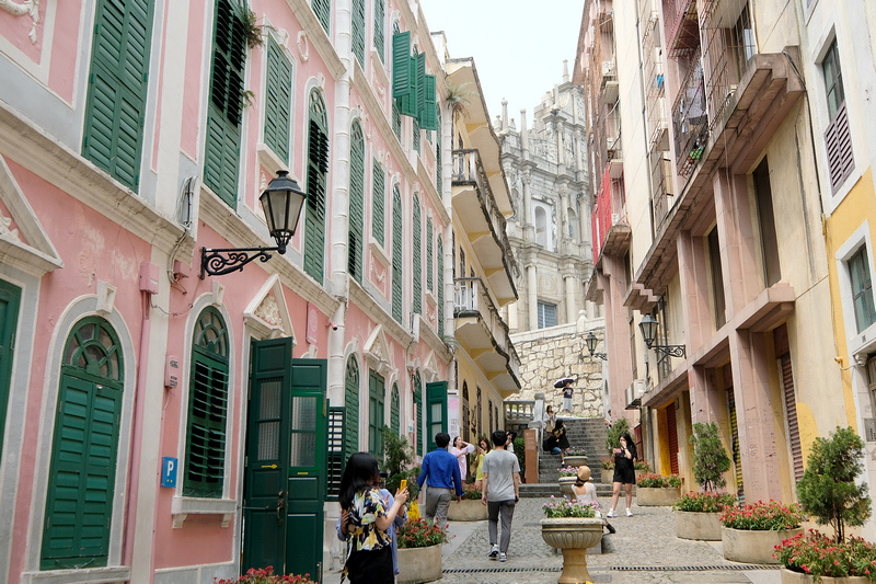 (背对大三巴)从大三巴牌坊右手边的台阶下去就能找到恋爱巷,从这里可以很清晰地拍到大三巴侧面近景。巧妙利用台阶和巷子构图,令大三巴主体更明显!