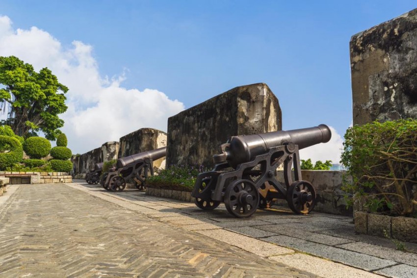 登上大三巴牌坊的台阶,按着指示牌朝大炮台的方向往上爬,不需要爬太高也能找到很棒的机位,沿坡有些绿植,找好位置和角度就能开拍。