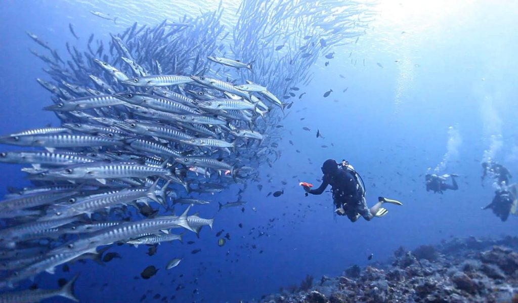 看点:每日10:00/14:00可观测到20+头白鳍鲨群游