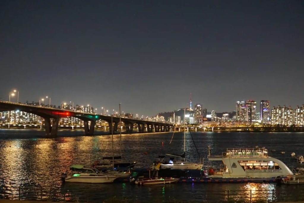江边偶尔有一些船上餐厅播放当季热门的Kpop歌,比如SEVENTEEN的《音乐之神》,鬼怪里的《beautiful》,增添了一份韩剧的冬日感。